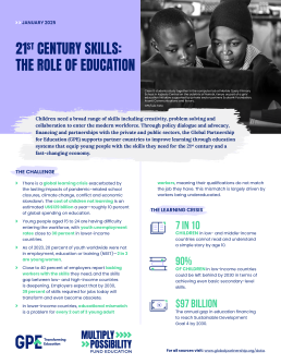 Through global policy dialogue and advocacy, financing and knowledge investments, GPE focuses on building quality, inclusive education systems that provide crucial foundational learning skills and prepare students for the transition to the world of work.