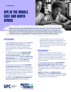Across the Middle East and North Africa, there are 9 GPE partner countries and 6 additional countries and territories eligible to receive GPE support.