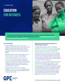 - Planning, policy dialogue and financing: GPE prioritizes funding to countries where too few children complete school and countries affected by fragility and conflict, which have higher numbers of out-of-school children. GPE has developed a policy dialogue tool to include refugees into national education systems.