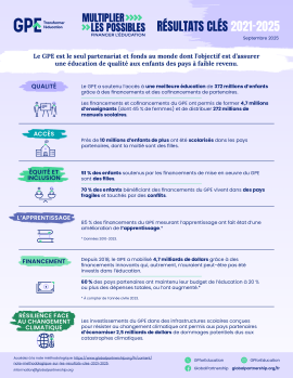 Découvrez les résultats du GPE en matière d'accès, d'équité et d'inclusion, de qualité de l'enseignement, d'apprentissage, de résilience face au changement climatique et de financement pour la période 2021-2025.